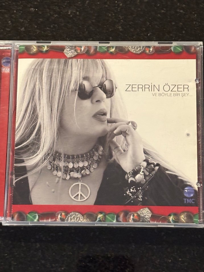 Zerrin Özer'in 'Ve Böyle Bir Şey' albümünün CD'si, şık siyah-beyaz kapak tasarımına sahip. Kenarlarda dekoratif detaylar bulunur. Orijinaldir.