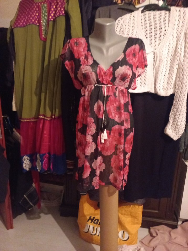 Koyu pembe tie-dye desenli, kolsuz bohem midi plaj elbisesi. V yaka ve kemerli, bol kesim. Yumuşak sentetik kumaştan, günlük kullanıma uygun. boy 80cm beden s/m