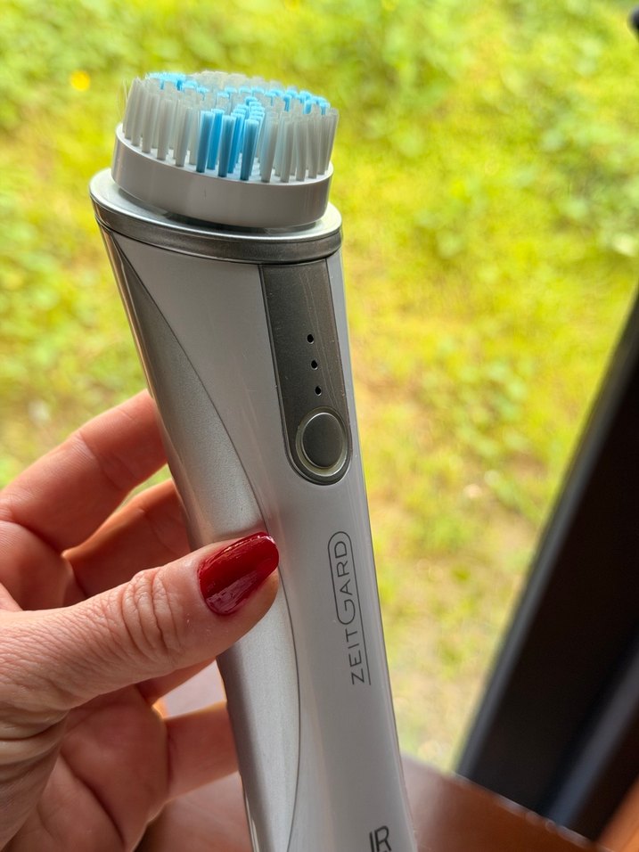 Zetgard yüz temizleme cihazı, yumuşak gri ve mavi kıllara sahip beyaz gri sapıyla nazik temizlik sağlar. Ergonomik tasarım ve kontrol düğmeli.