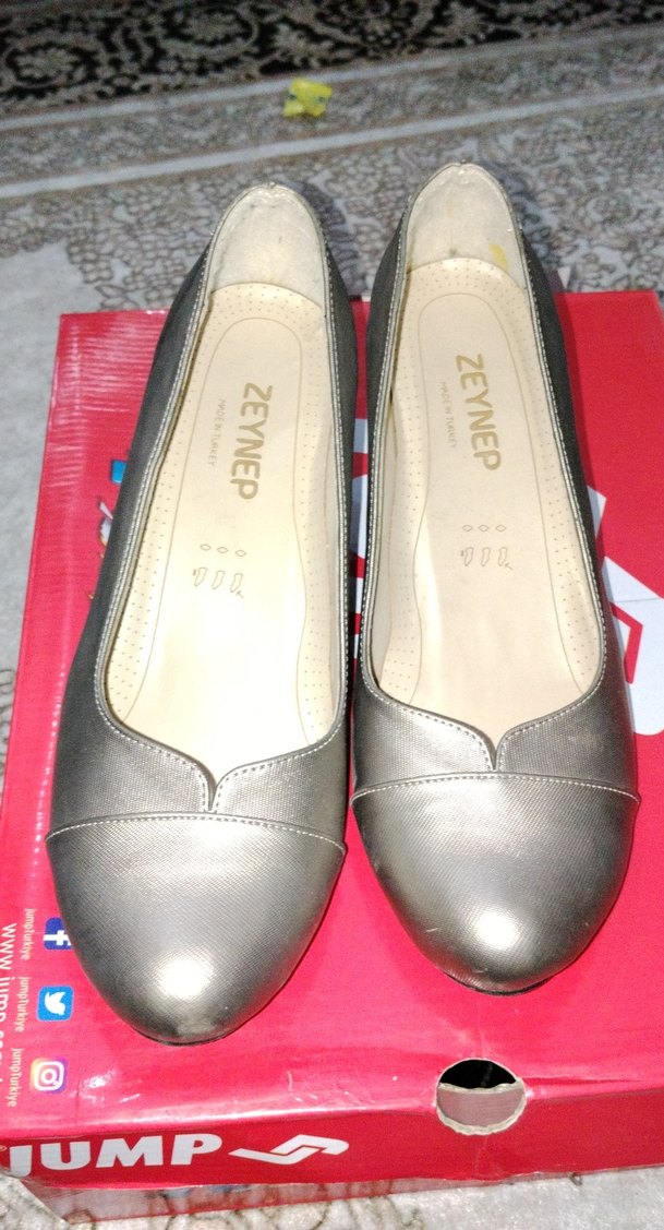Zeynep markalı, gri renkli, pliseli ve yüksek topuklu kadın babetler. Kauçuk malzemeden üretilmiş, ofis için uygun klasik stile sahip.