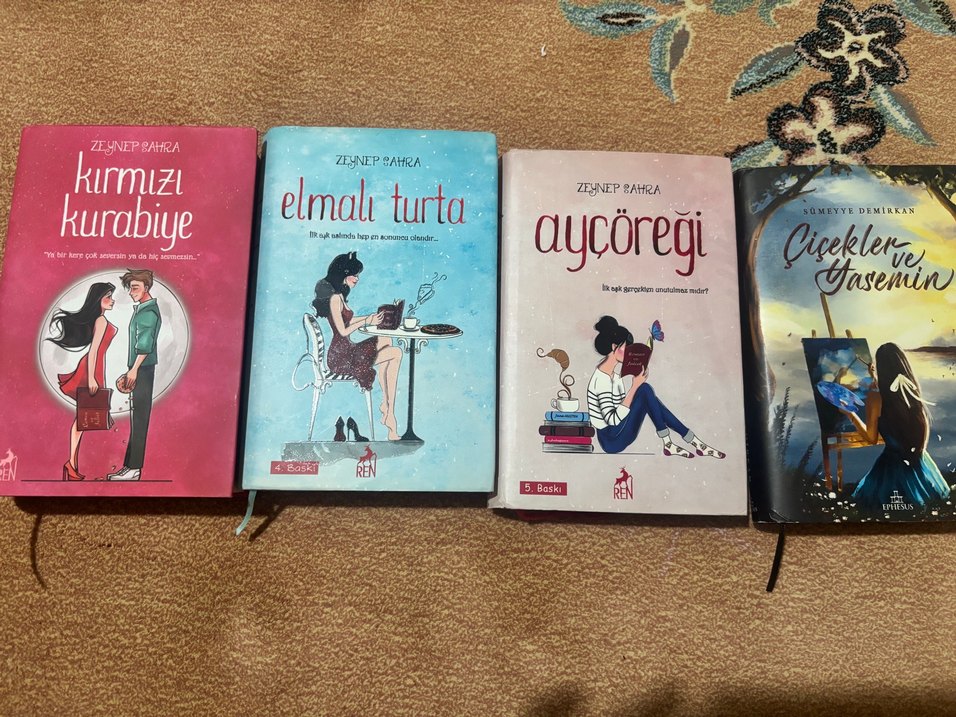 Zeynep Ahra'nın 'Elmalı Turta' ve 'Ayçöreği' romanları, kadın figürlü kapak tasarımlarıyla REN yayınevinden. Ufak hasarlar var ciltlerde hepsi toplam 350 tl 4 kitap