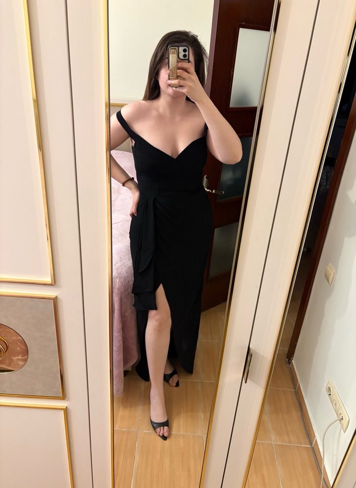 Arkadaşımın düğünün de bir kereliğine giydim, kuru temizlemesi yapılmıştır, kalıbı dardır, önüne tadilat yapılmıştır, orjinal halinde çok dekolteli ve göğüs kulbu küçük bilginize