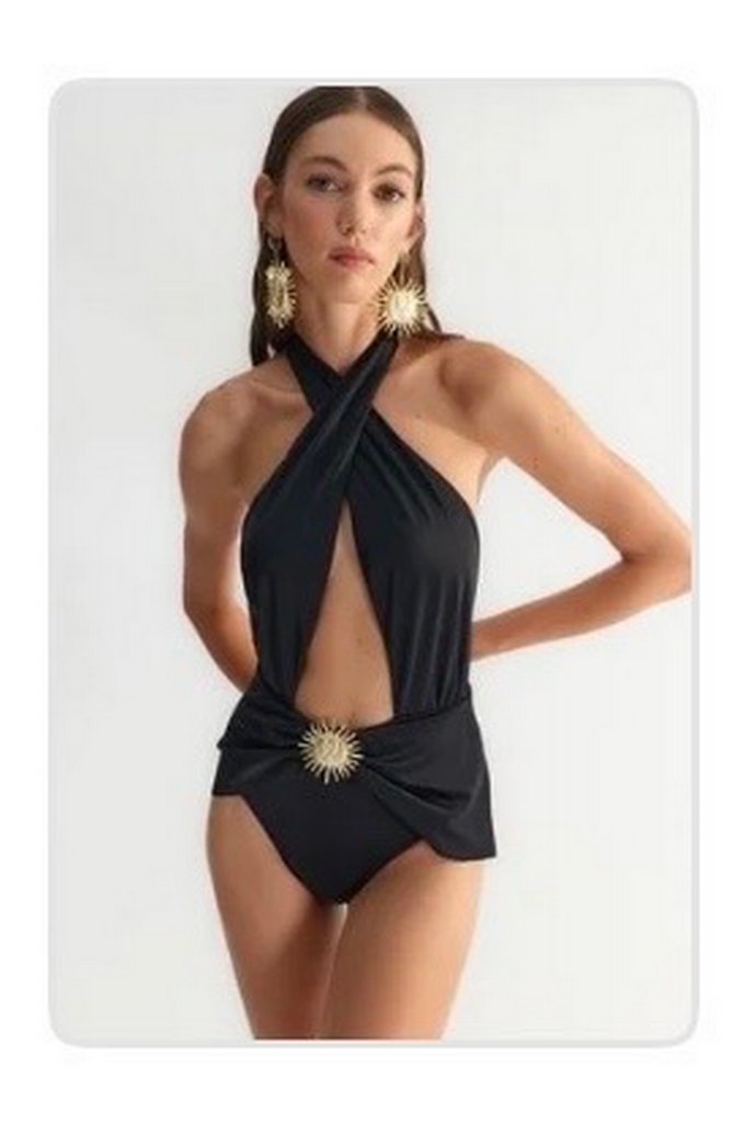 Drapeli, askılı ve kısa kesim siyah kadın mayo, cesur ve şık bir parti görünümü sunar. ✨