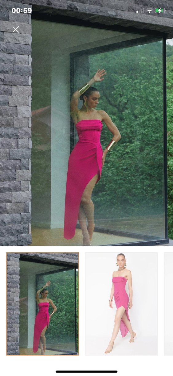 Drapeli detaylara sahip, pembe baskılı kumaştan yapılmış, straplez ve vücuda oturan uzun gece elbisesi. Modern tarzda, strappy kollu ve avangart bir görünüm sunar. Zeynep tosun tasarımı bendeki 36 bedendi ama 34 gibi oldu daralttırdım bir kez giydim