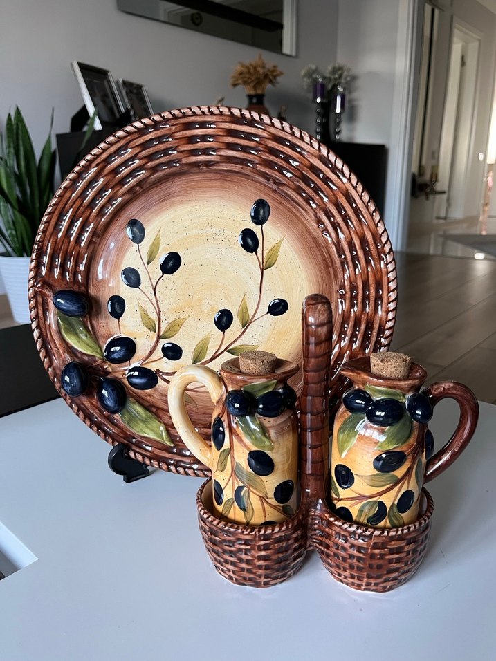 Dekoratif, Seramik tabak ve mantar kapaklı iki kap içeren set, 3 boyutlu, koyu zeytin dalı desenli ve sepet dokulu tabanlıdır. Mutfak için uygun… Tabak Çapı 30cm. Yağlık seti 20/18cm.