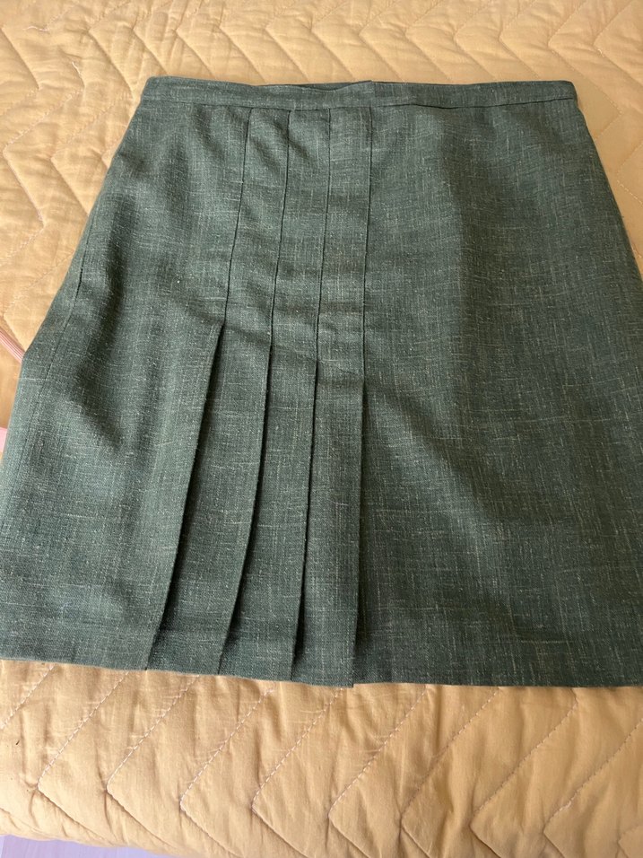 Zeytin yağı rengi keten kumaştan, pilili ve normal boyda, ofis kullanımı için uygun midi kadın etek.