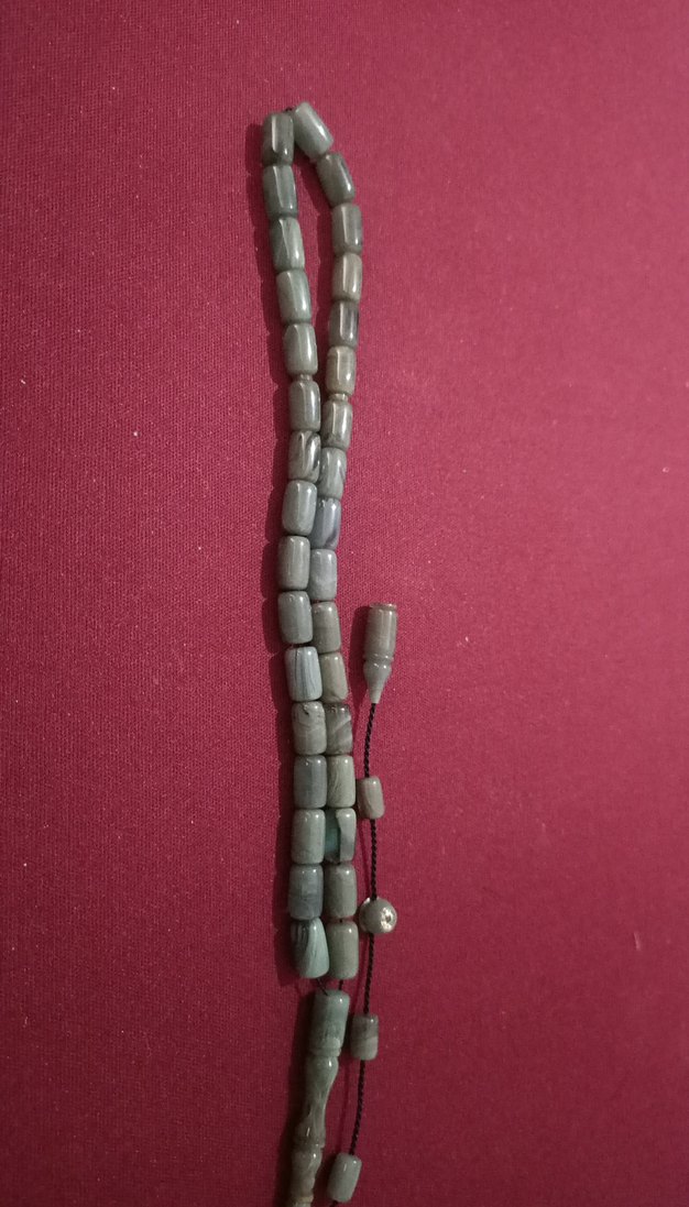 Mesut Elma ustanın minimalist bohem tarzda gri yeşil renkli, dayanıklı ip üzerinde düzgün dikdörtgen boncuklardan oluşan tesbih. gayet şık ve güzel. Ben biraz çektim ve renk aldı iki yıldır koleksiyonumda. Usta ismi boncukta yakınlaştırıp çektim.Katalindir bu arada.