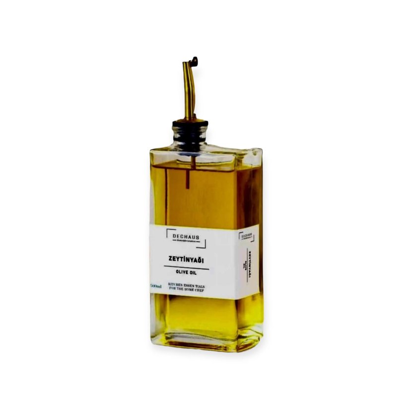 zeytinyağı şişesi. Kolay dökme için metal bir ağızlığı vardır. Etikette 'ZEYTINYAĞI' yazılıdır.