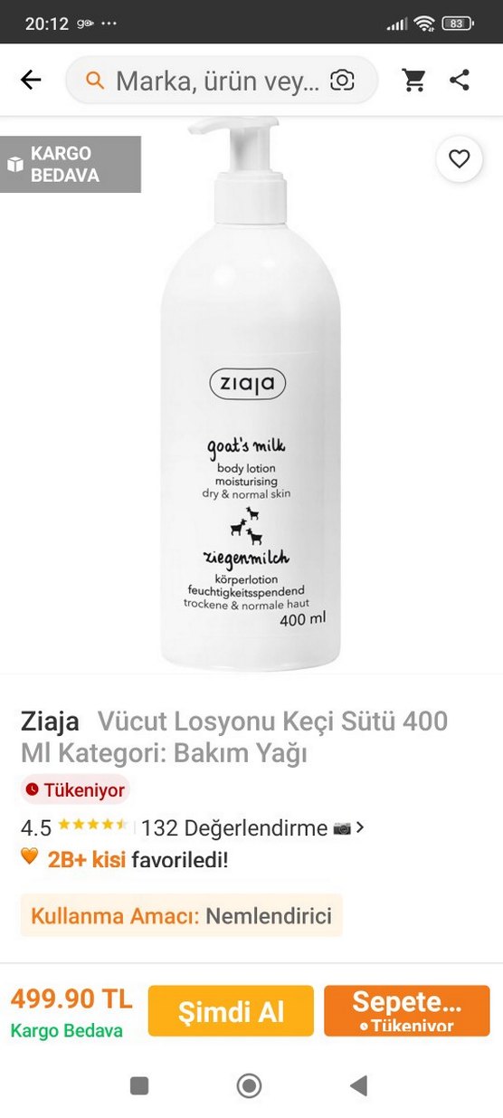 Ziaja keçi sütü içeren 400 ml vücut losyonu, kuru ve normal cildi nemlendirir ve uzun süre bakım sağlar.