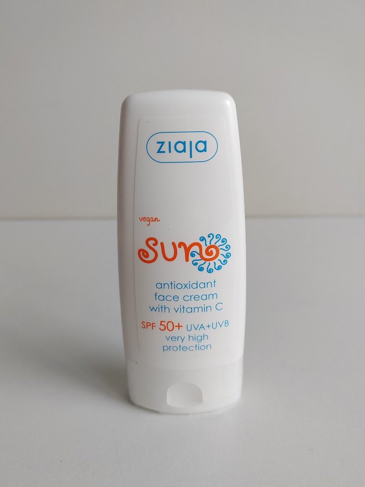 Ziaja vegan yüz kremi, C vitamini ile SPF 50+ çok yüksek koruma sağlar ve antioksidan bakım sunar..