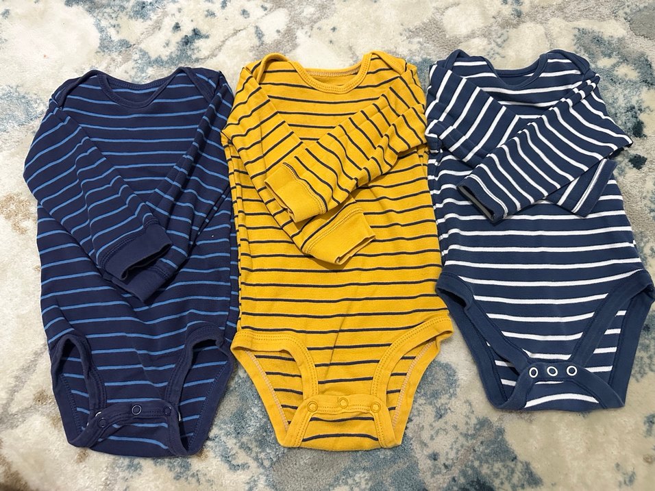 Sarı çizgili, uzun kollu ve bisiklet yakalı pamuklu bebek body. Basit ve şık tasarımıyla rahat kullanıma uygundur. 2 tanesi carters marka 1 tanesi hm marka.