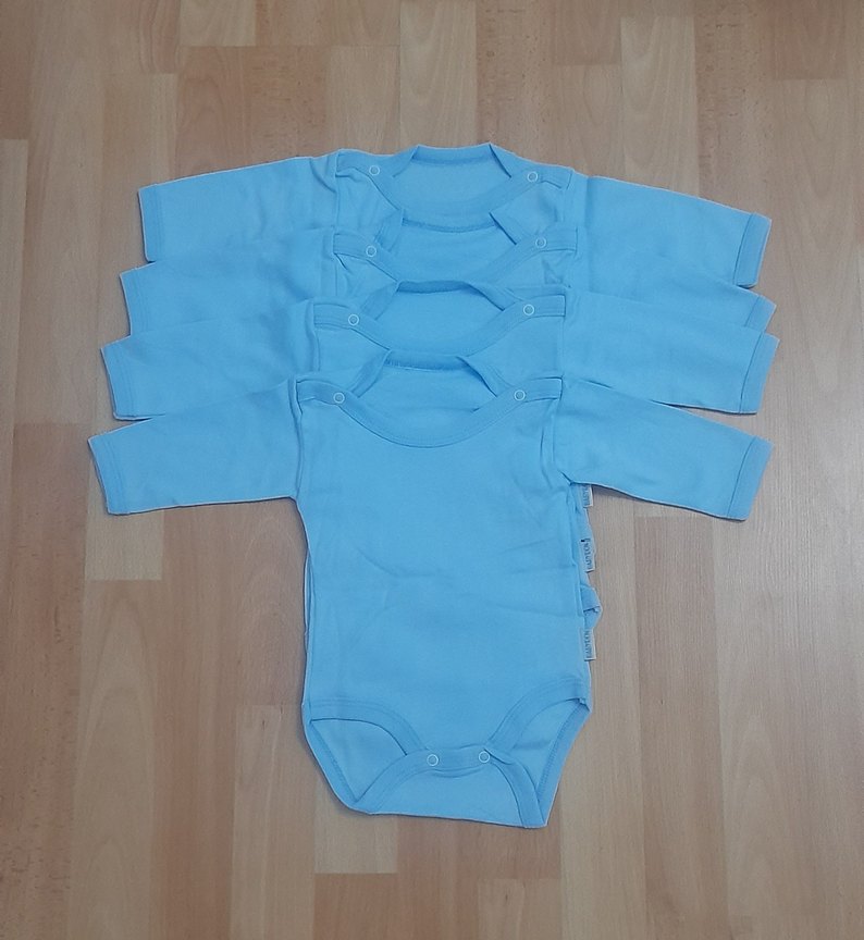 Bebek erkek uzun kollu, bisiklet yaka, pastel mavi renkte, yumuşak ve sıcak kumaştan yapılmış body. Kolay giydirme için çıtçıtlıdır.
