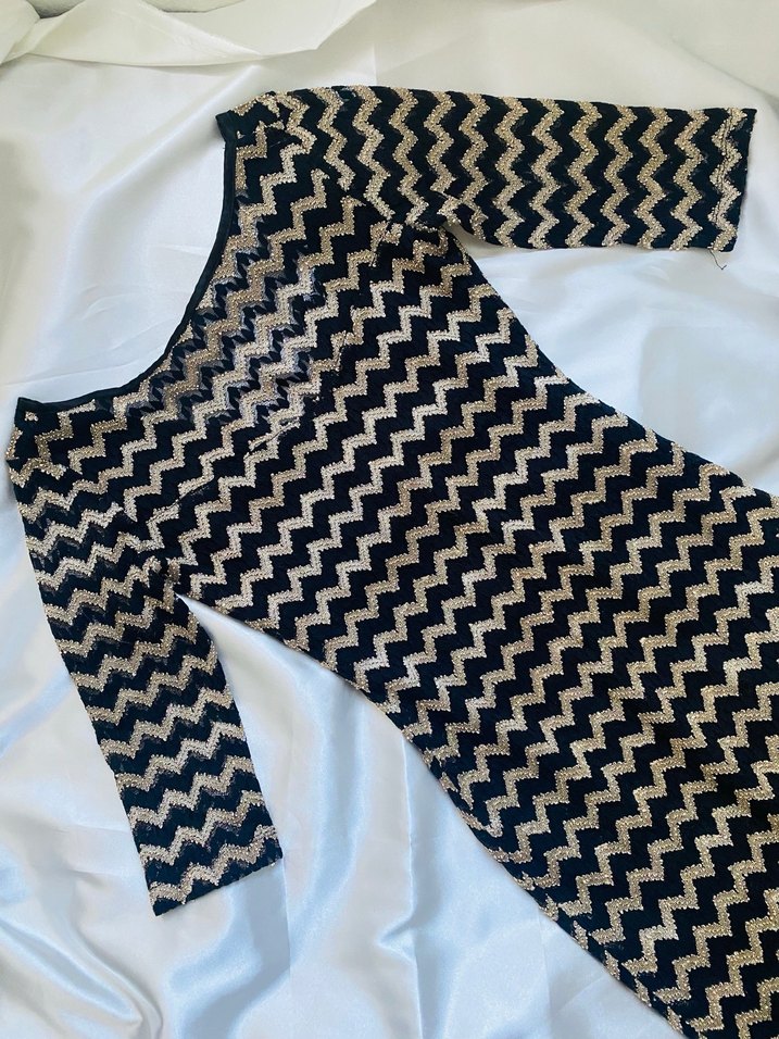 Parlak zigzag desenli, tekne yaka ve askılı kollu, vücuda oturan siyah midi elbise. Örgü yapıda, parti için uygundur. ✨
