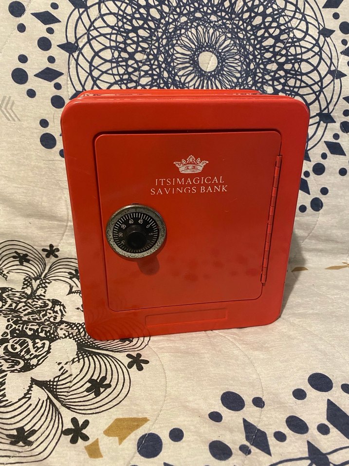 Kombinasyon kilidi olan küçük kasa şeklinde renkli kumbara. Önünde 'ITSIMAGICAL SAVINGS BANK' yazısı bulunur.