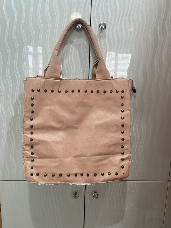 Pudra renkte, fermuarlı, perçin detaylı deri kadın çantası, minimalist ve sokak stiline uygun. Ölçüler 35x35 cm temiz ve ihtiyaç fazlası ürün. Sağ altta bir zımbası düşmüştür fakat kullanıma engel değildir