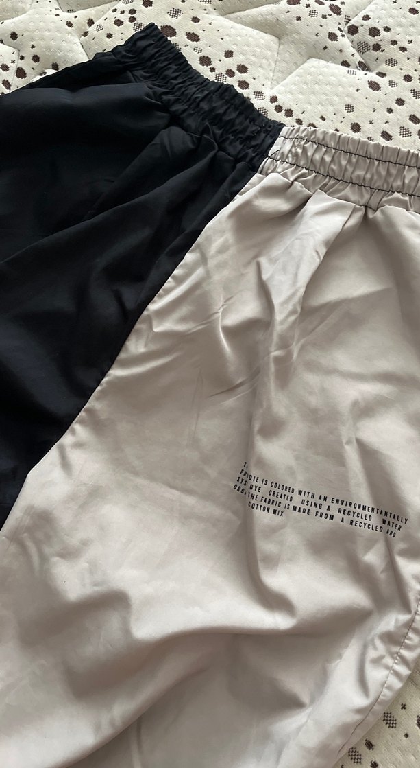 Gri ve bej renklerde, fermuarlı cepli, yumuşak sentetik kumaştan, midi boyda, bol kesim kadın pantolonu. Günlük sokak stiline uygun.
