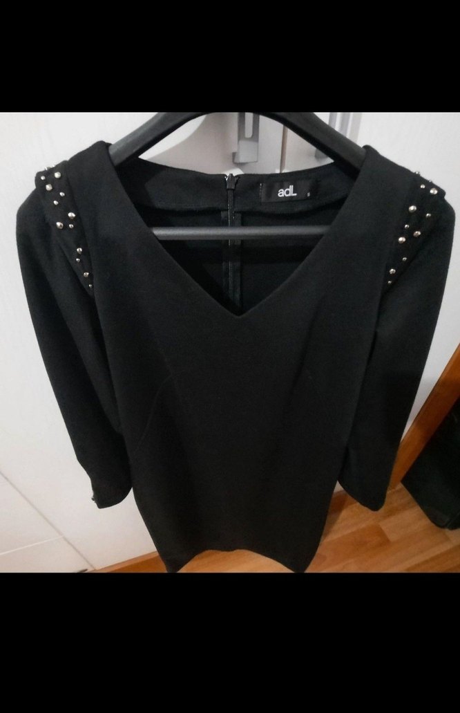 V yaka, uzun kollu, omuzlarda zımba detaylı bel hattini belli eden siyah mini elbise. Gotik ve avangart tarz için uygun.