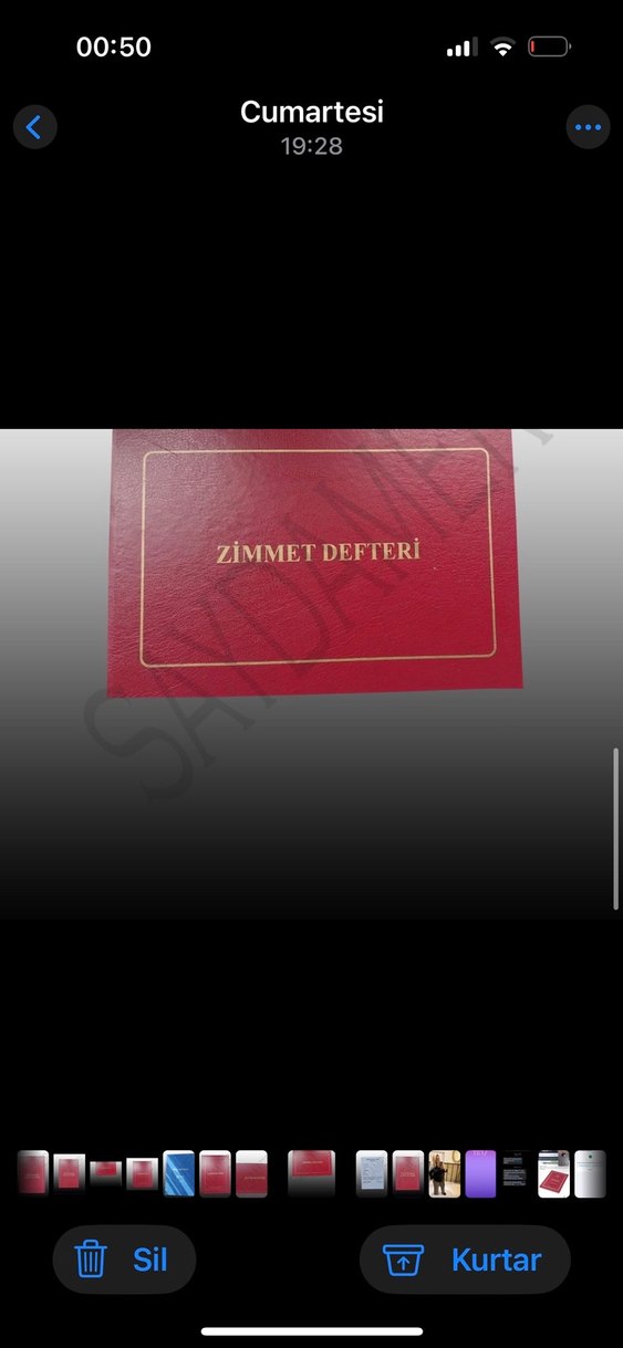 Kapağında altın harflerle "ZiMMET DEFTERİ" yazılı kırmızı Osmanlıca kitap. Defter veya kayıt kitabı olarak kullanılmış olabilir.