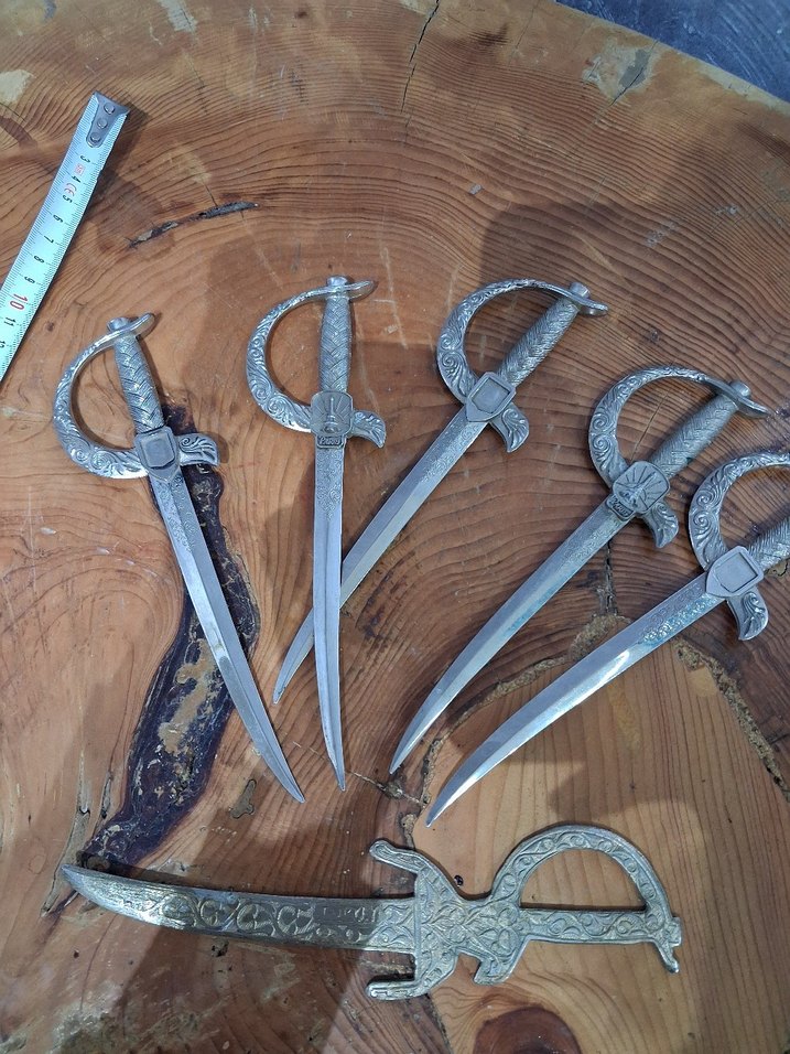 Gri metalden yapılmış, küçük kılıç şeklinde detaylı saplara sahip dekoratif kesme bıçakları seti. Koleksiyon veya temalı kullanımlar için uygundur. ⚔️
