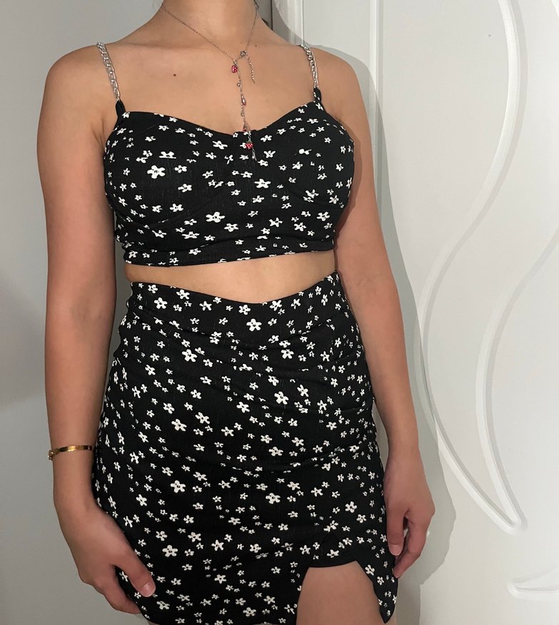 Zincir askılı çiçek desenli Siyah Straplez Bustiyer etek