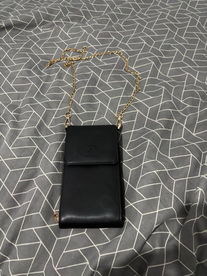 Zincir askılı siyah deri çapraz çanta çok az kullanıldı 3 bölümden oluşuyor cüzdana benzer bölümleri var kartlık yeri gibi. Son fotoğrafta detaylı çektiğim gibi üzerinde çok az belli olan bir beyazlık var onun dışında hiçbir kusuru yok.