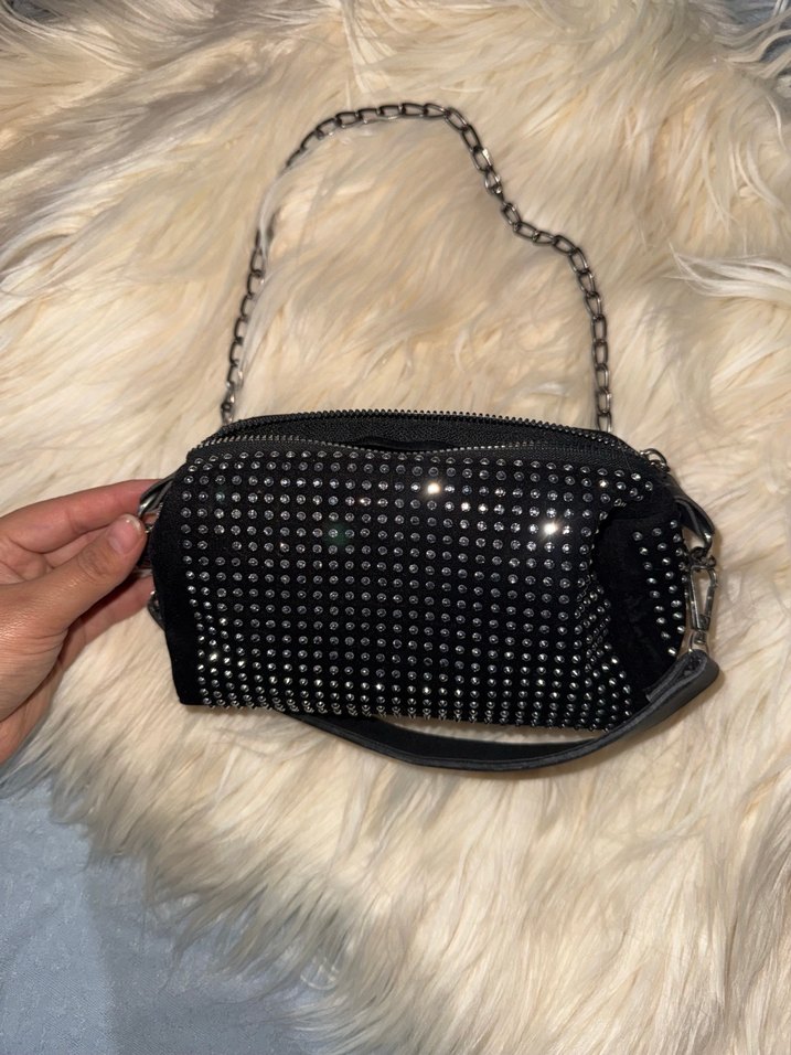 Siyah taşlı, fermuarlı ve zincir askılı taşlı çanta. Hem şık hem kullanışlıdır.