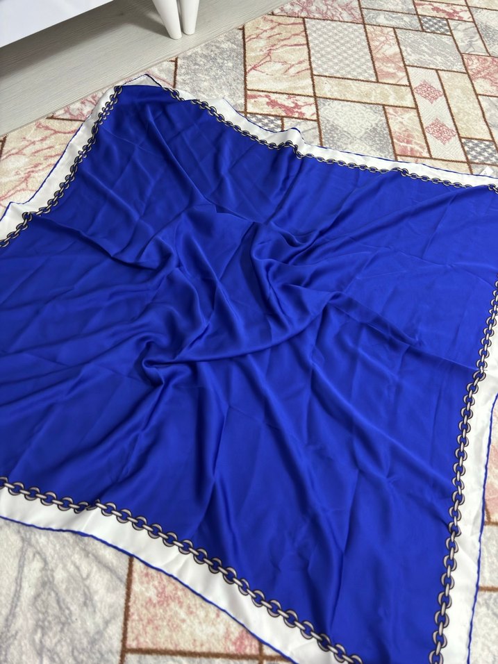 Parlak mavi renkte, ipek görünümlü ve drapeli kadın şal. Kenarında zarif desenli bordür bulunur, mütevazı ve bohem tarzlara uygundur.