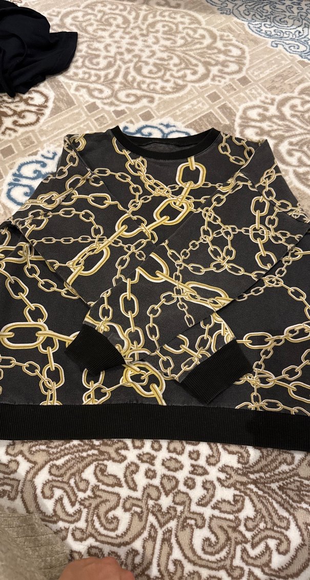 Kadın sweatshirt, gevşek kesim, uzun kollu ve bisiklet yaka. Yumuşak sentetik kumaş üzerinde koyu altın zincir desenli, günlük kullanıma uygun.