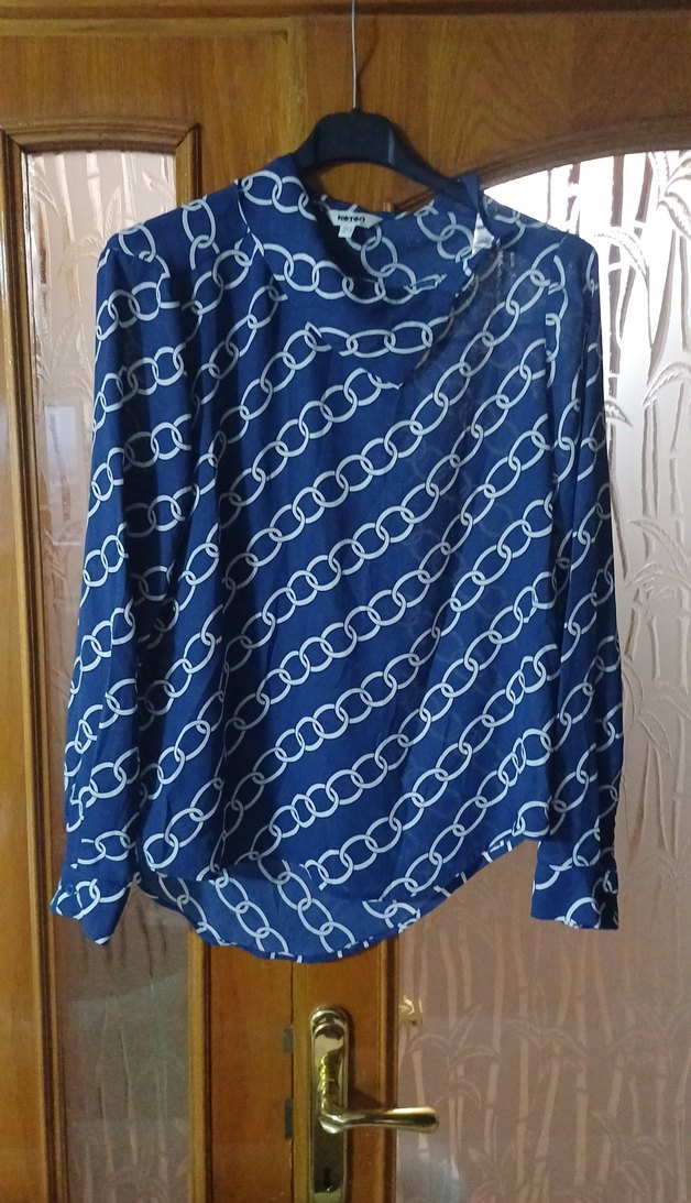 Bu mavi kadın gömleği, parlak zincir desenine sahip olup, yüksek yakalı ve uzun kolludur. İpeksi kumaştan yapılmış, bol kesim ve normal uzunluktadır.