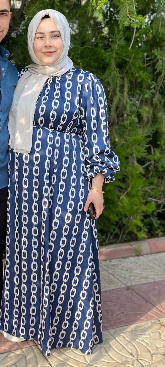 Zincir Desenli Mavi Uzun Elbise