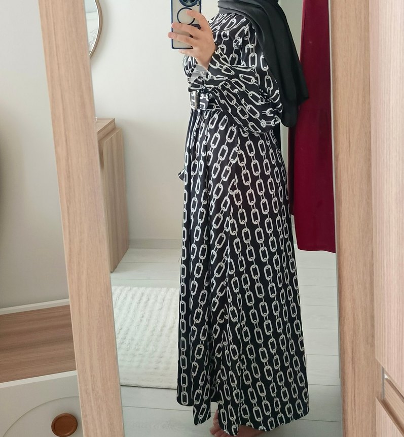 Yüksek yakalı, askılı kolları ve bol kesimi olan siyah uzun elbise. Zincir desenli, sentetik kumaştan, mütevazı Paris tarzı için uygun günlük elbise.