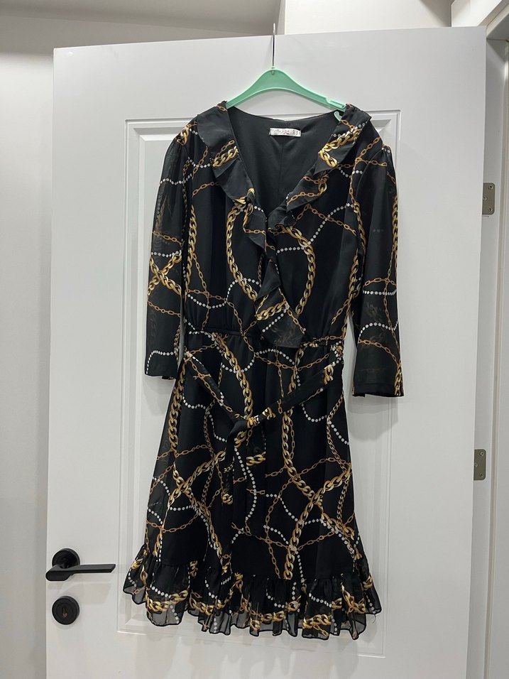 Zincir desenli ve fırfır detaylı uzun kadın akşam elbisesi. Koyu renk tonlarında ve vücuda oturan kesime sahip. Ofis için uygun. ✨