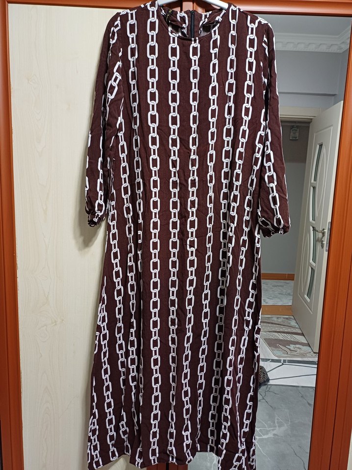 Zincir Desenli Uzun Kahverengi Elbise