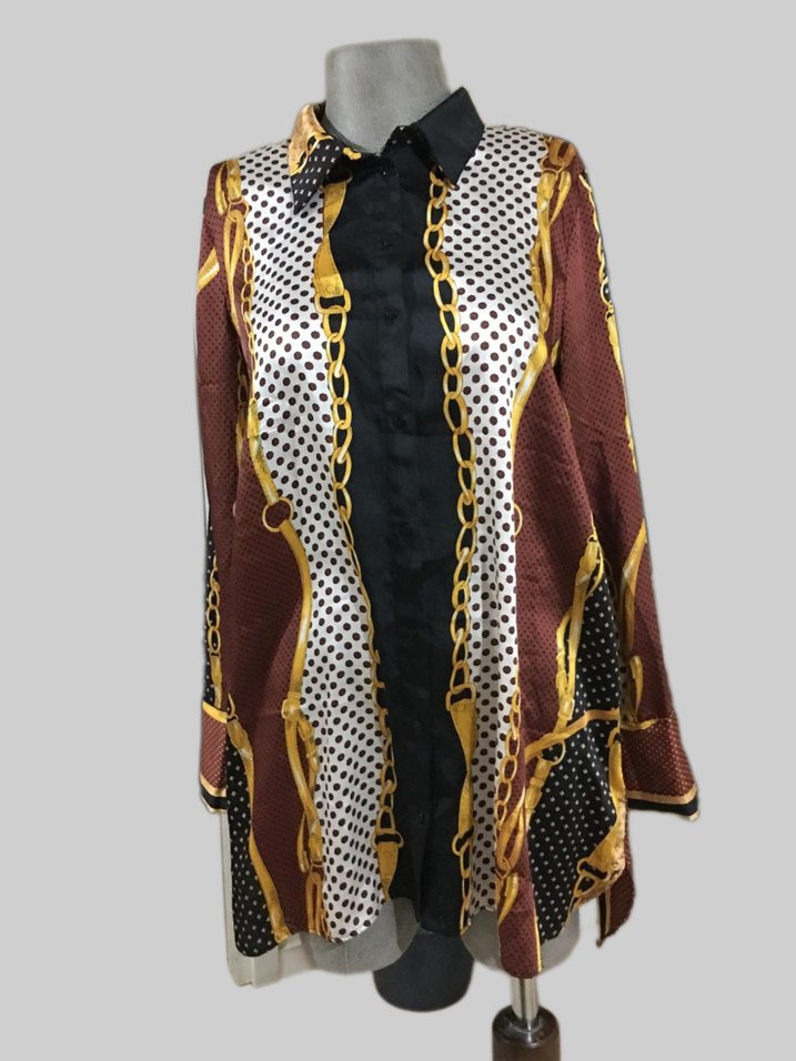 Kahverengi, uzun boylu, zincir detaylı desenli kadın gömlek. İpek gibi kumaş, bol kesim, uzun kollu ve kesik yaka ile ofis kullanımı için uygun.