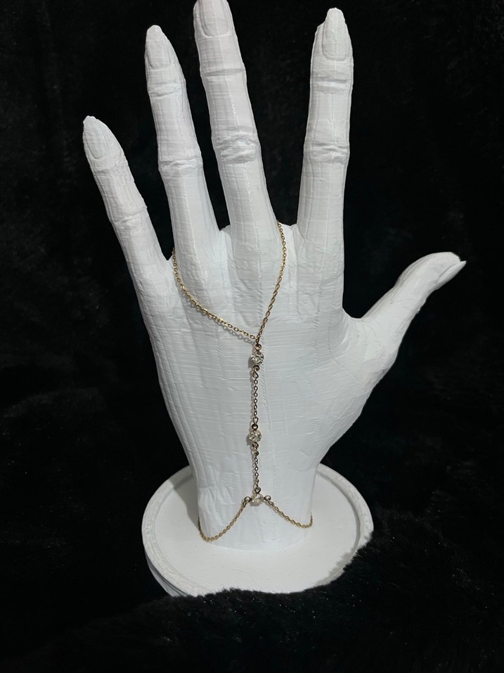 Zincir detaylı, hafif yılan desenli altın kadın el zinciri, günlük kullanıma uygun minimal ve avangart tarzda.