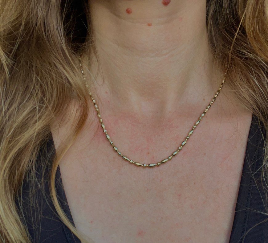 Zincir detaylı, parlak altın renkli kolye. Normal midi uzunluğunda, minimalist ve bohem tarzlara uygun, günlük kullanıma ideal. ✨