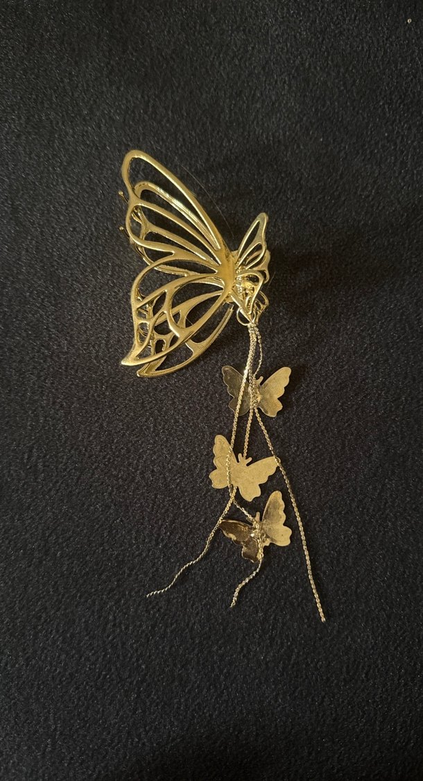 Zincir detaylı, altın renkli kelebek saç aksesuarı. İpeksi dokulu ve avant-garde gotik tarzda, moda tutkunları için uygun.