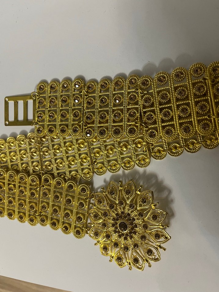 Zincir detaylı, parlak altın renkli, bohem tarzda kadın kemeri. Örgü kumaş ve çiçek desenli süslemeye sahip.