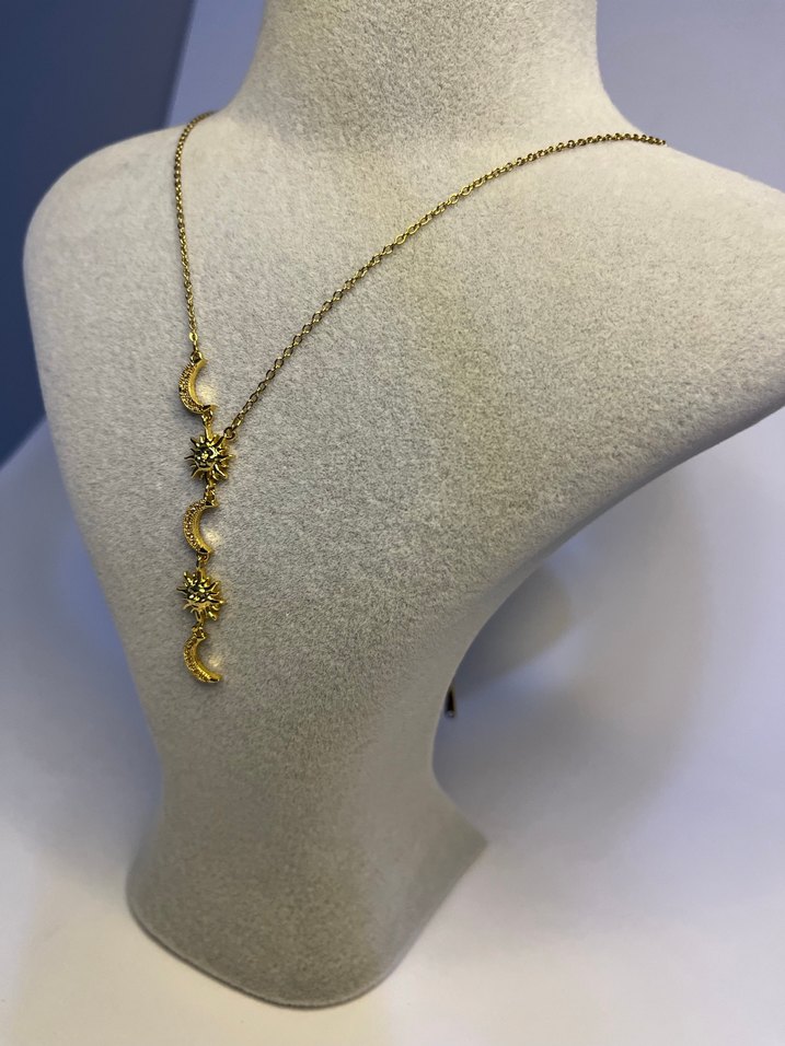 Altın renginde, zincir detaylı ve nakış desenli, günlük kullanıma uygun normal midi uzunlukta bohem kadın kolyesi. ✨