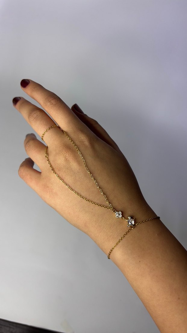 Zincir detaylı, minimal tasarımlı altın renkli el zinciri, iki küçük taşla bohem dokunuş katıyor. Günlük kullanıma uygun. ✨
