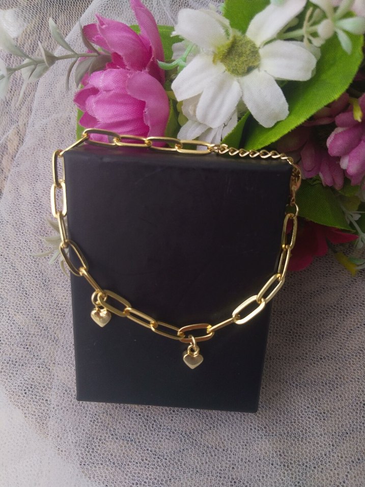 Parlak altın renkli zincir bileklik, kalp figürlü detaylarla romantik akşamlar için minimalist ve bohem tarzda cesur bir tasarım.