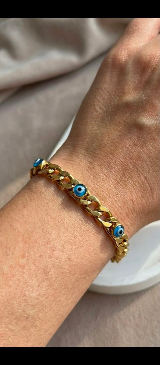 Parlak yüzeyli, mavi göz detaylı altın renk zincir bileklik. Bohem tarzını yansıtan günlük kullanıma uygun aksesuar. ✨316 L çeliktir. Kararma yapmaz. Antialerjeniktir. Denizde ve havuzda rahatlıkla kullanabilirsiniz