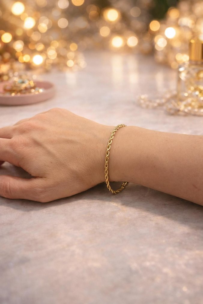 Altın renginde, zincir detaylı ve parlak yüzeye sahip kadın bileklik. Minimalist bohem tarzıyla günlük kullanıma uygun. ✨