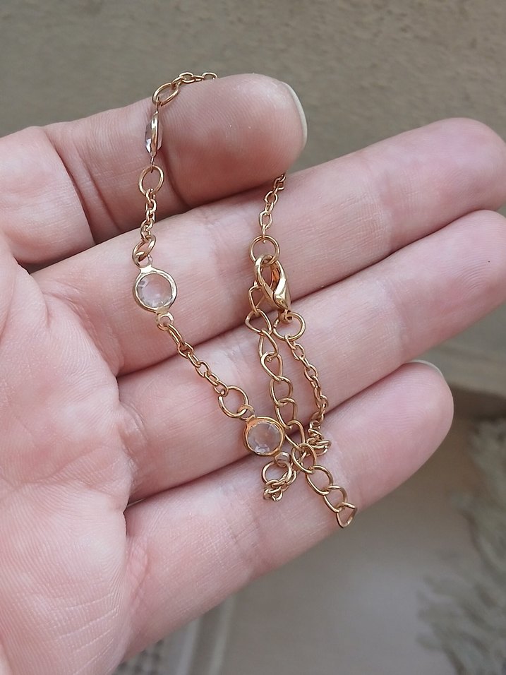 Minimalist bohem tarzda, zincir detaylı ve küçük şeffaf taşlı altın renkli kadın el zinciri, günlük kullanıma uygun. ✨