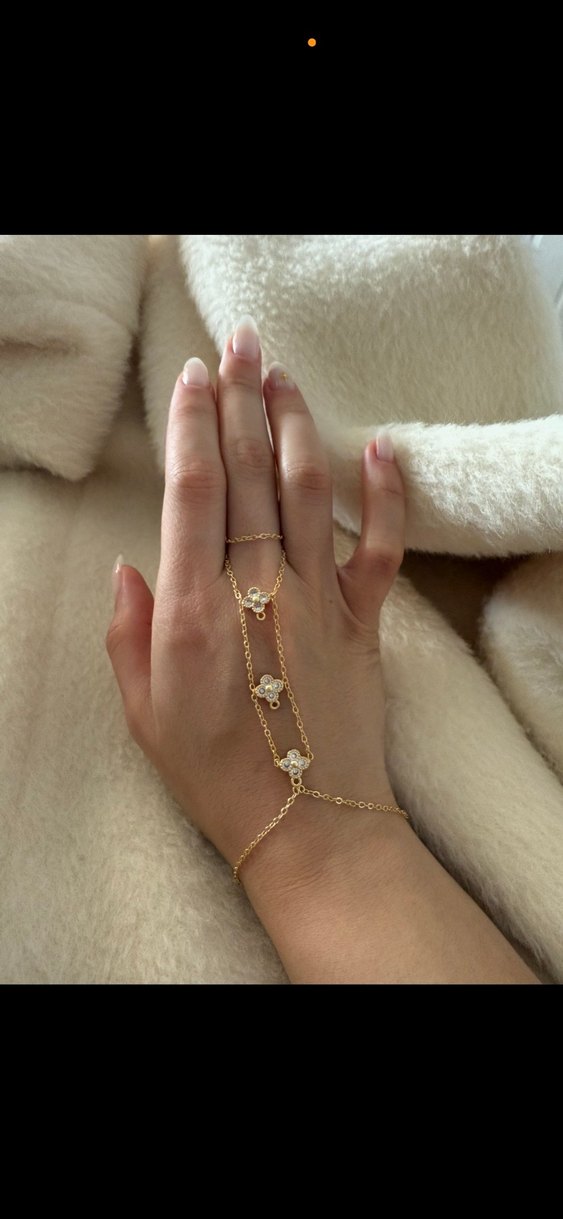 Zincir detaylı ve küçük çiçek süslemeli altın renkli el zinciri. Minimalist yılan deseniyle günlük kullanıma uygun, bohem tarzda.