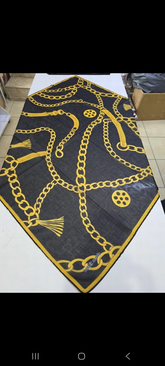Kadın eşarp, koyu zemin üzerine altın renkli zincir desenleriyle, yumuşak sentetik kumaştan üretilmiştir. Bohem ve Paris tarzını yansıtır.