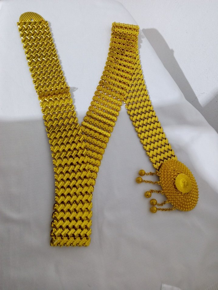 Örgüden yapılmış zincir detaylı, altın renginde, renkli ve avangart tarzda kadın kemeri. ✨