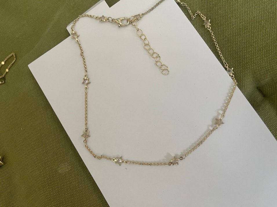 Altın renginde, zincir detaylı ve küçük yıldız figürlü kolye. Midi uzunlukta, minimal ve bohem tarzda, günlük kullanıma uygun. ✨