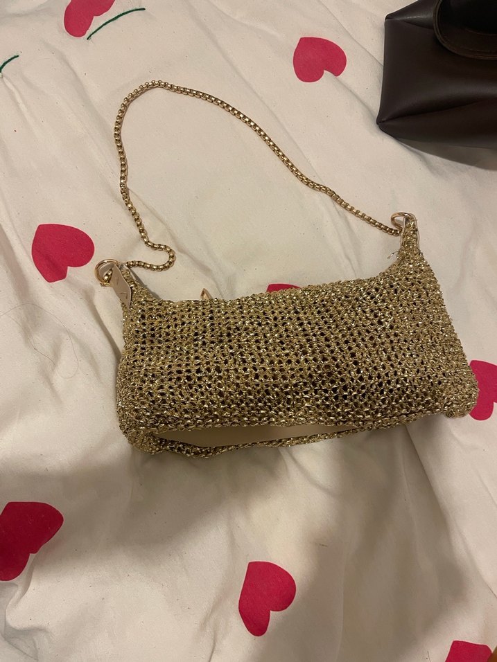 Altın renkli örgü kadın çanta, zincir detaylı ve parlak yüzeye sahip. Minimalist ve retro tarzıyla romantik akşamlar için uygun. ✨