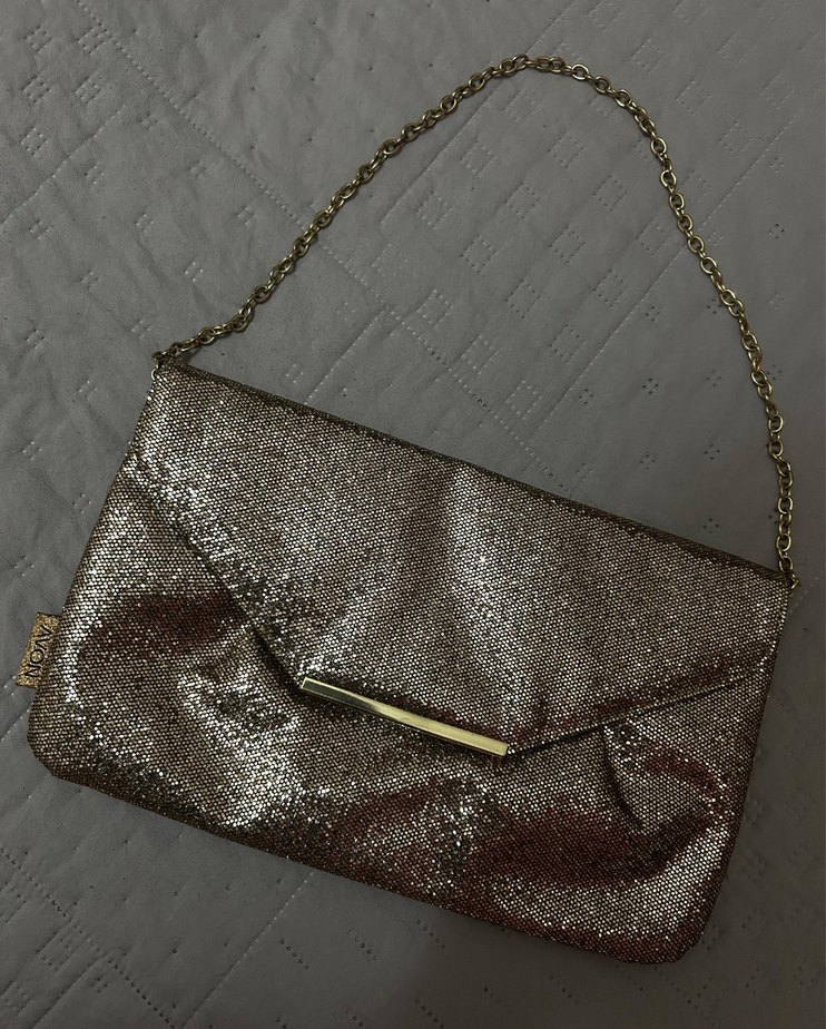 Zincir detaylı,payet desenli parlak altın renkli deri kadın çantası, romantik akşamlar için modern klasik şıklık sunar. ✨